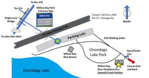 The entrance to the Onondaga Lake Park / Willow Bay area is accessed only through Long Branch Road. Use either John Glenn Blvd or Route 370 to get to Long Branch Road. Turn at the Willow Bay sign, go under the bridge and park in one of the lots. Make the short walk to the race headquarters at the Sawmill Creek Pavilion. Flat, certified (NY83004TC) out and back course along the East Shore of Onondaga Lake. Start at Willow Bay, turn around near the Yacht Club, and finish at Willow Bay. Packets can be picked up at Fleet Feet’s Clay store on Route 31, on Thursday, August 13, 2026, between 5:00-6:30 PM, or at the race site on the morning of the race. Fleet Feet is located at 4136 State Route 31, Clay, NY 13041, near Staples, across from Great Northern Mall. Packets will also be available on-site on race morning. Posted on this website and submitted to USATF’s Road Running Information Center for the recognition of nationally ranked performances. Bathrooms are available throughout the park. Refreshments will be provided for all runners and walkers following the race. Come dressed to run. Pre-registration includes an attractive souvenir shirt while supplies last. Please be advised that shirt sizes are women’s fit! To enter, please sign up at WillowBay5k Run Signup